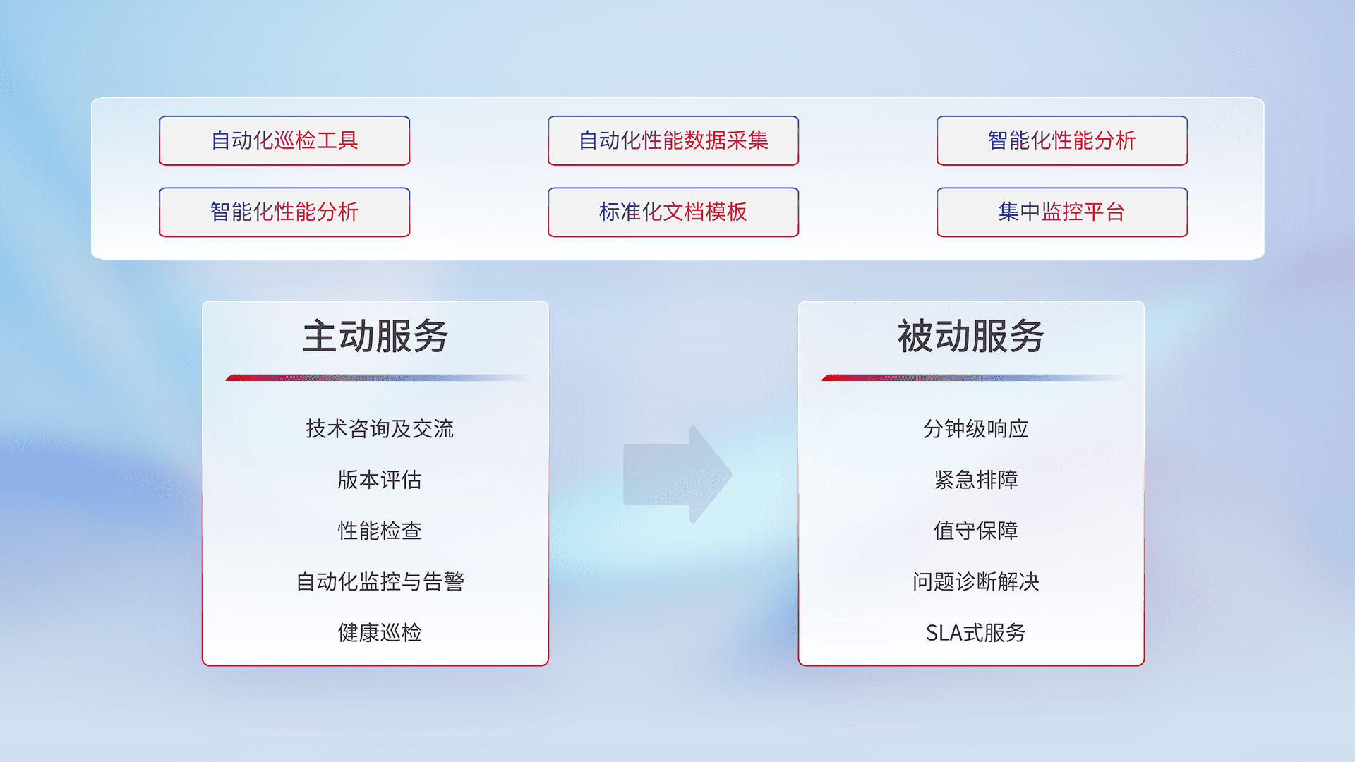 智能化工具和标准化文档,,,保障服务质量,,提供主动服务(包含技术咨询、、、版本评估、、、、性能检查、、、自动化监控与告警、、、健康巡检)和被动服务包含(分钟级响应、、紧急排障、、、、值守保障、、、问题诊断解决、、、、SLA服务)。。。。